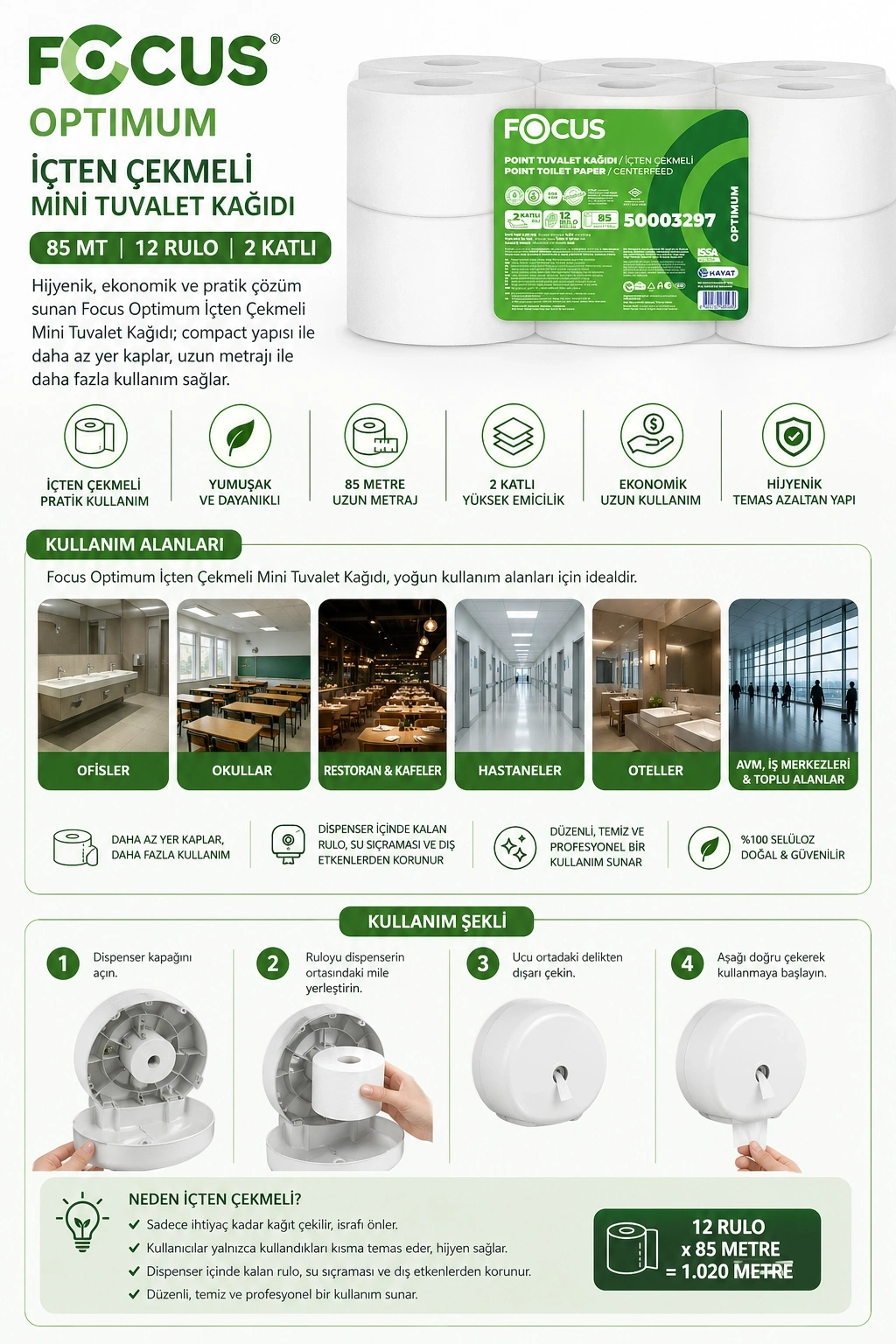 İçten çekmeli sistemi sayesinde pratik ve kontrollü kullanım sunan Focus Optimum mini tuvalet kağıdı, özellikle yoğun kullanım alanları için uygun bir çözümdür. Kompakt yapısı ile dispenser uyumlu kullanım sağlar.