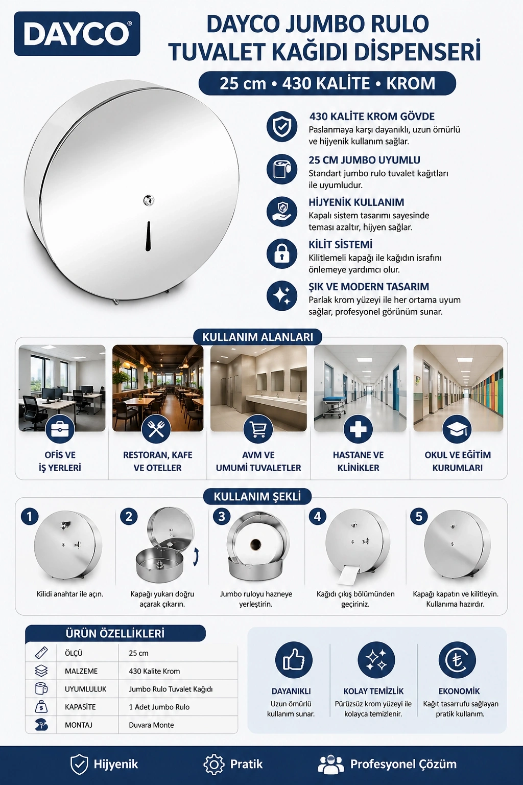 Dayanıklı ve şık tasarımıyla öne çıkan jumbo rulo tuvalet kağıdı dispenseri, yoğun kullanım alanları için pratik bir çözümdür. 430 kalite krom gövdesi sayesinde uzun ömürlü kullanım sunarken, hijyenik ve düzenli bir kullanım deneyimi sağlar.